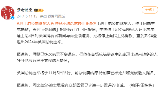 来源:参考消息[迪士尼公司继承人:停止向民主党捐款,直到拜登退选]据路透社7月4日报道,美国迪士尼公司继承人阿比盖尔·迪士尼4日对美国消费者新闻与商业频道说,她将停止向民主党捐款,直到乔·拜登退出20